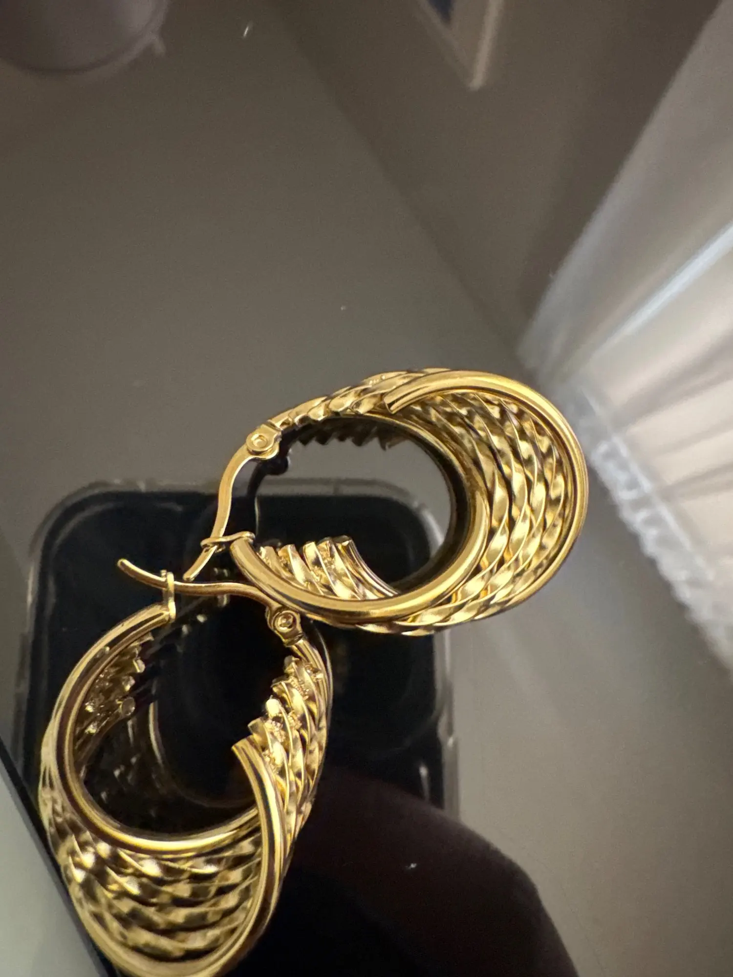 Crafted from stainless steel, these hoop earrings feature a geometric design and are plated with real 18K gold using PVD electroplating, offering durable elegance. Designed for women, these trendy hoops combine lasting quality with a modern aesthetic