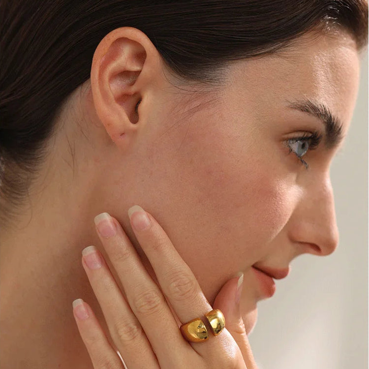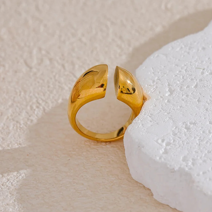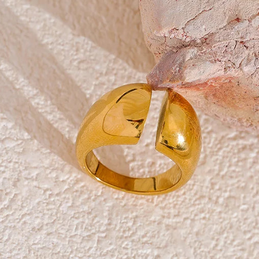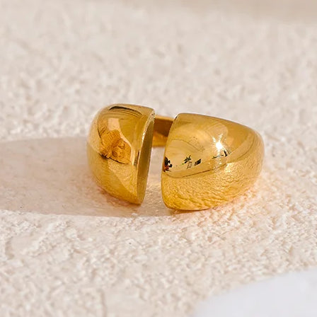 This contemporary geometric ring showcases premium 18k gold plating over durable stainless steel, combining modern aesthetics with lasting quality. The PVD electroplating process ensures exceptional resistance to tarnishing and wear, making it an ideal choice for daily wear or special occasions. Designed for women who appreciate minimalist elegance with an edge, this fashion-forward piece features clean lines and striking geometric proportions. Universally compatible and crafted without harmful chemicals, it delivers sophisticated style that complements any wardrobe while maintaining its lustrous finish season after season.