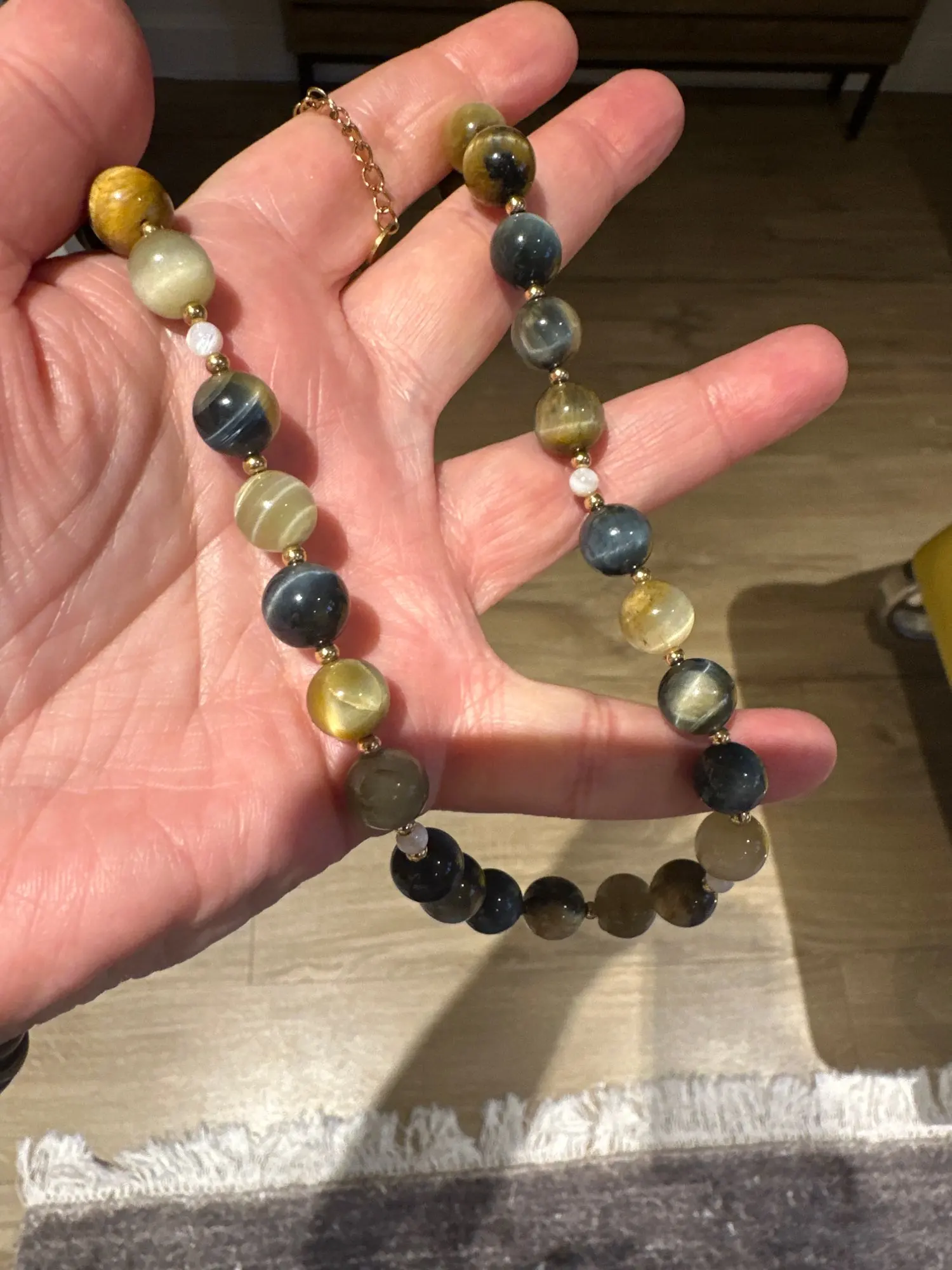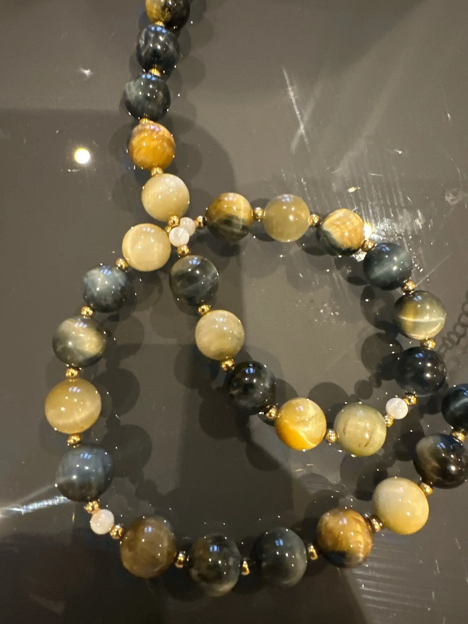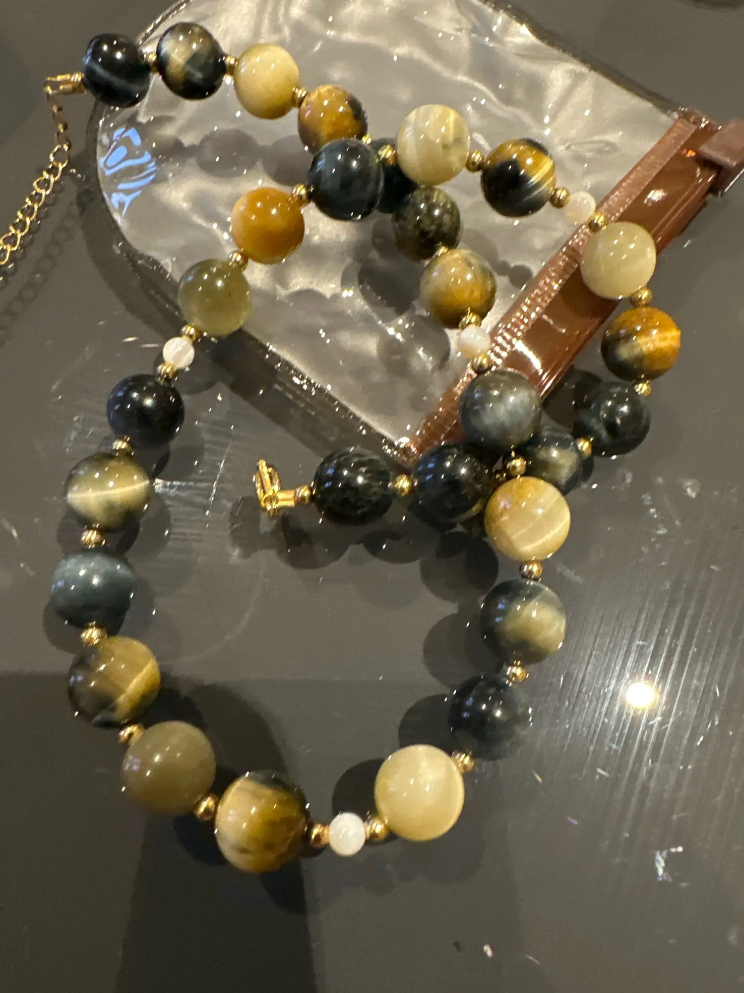 This Handmade Maillard Natural Stone Tiger Bead Necklace features stainless steel components paired with round natural stone beads for a trendy look. Designed as a pendant, it is universally compatible and finished with a durable PVD real gold plating, combining lasting strength with refined elegance.